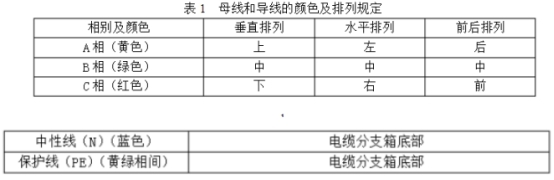 (1)選用選用矩形母線,質料為T2電工銅。并選用不同相色熱縮套管做絕緣處理。熱縮套管不得開裂和起皺,母線接頭處用熱縮絕緣盒封閉。絕緣熱縮護套資料應具有阻燃、防腐、抗老化的要求,老化壽數不小于30年,具體實驗方法和要求參照GB/T2951.14中規矩實施。(2)銅排截面的挑選應保證可以耐受IEC60298中引薦的額定短時耐受和峰值耐受電流的要求,N相(L0)母線與三相母線標準相同,PE排截面不低于相排截面的1/2。其間設于野外的低壓電纜分支箱裝備4根母排(3L+PEN),設于戶內的低壓電纜分支箱裝備5根母排(3L+N+PE)。(3)設備中母線和導線的顏色及擺放應契合GB/T4026和GB7947及表1的規矩;