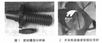 10kV充氣柜作業(yè)一段時間后,低氣壓報警主張,斷路器氣室壓力下降,經(jīng)SF氣體檢漏儀檢測為穿墻套管部分漏氣,拆開穿墻套管后發(fā)現(xiàn)密封槽部分碎裂,如圖1所示,開關(guān)柜底板密封部位完好,如圖2所示。