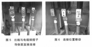 穿墻套管下部為出線,與電纜銅搭子導體部直接聯(lián)接,如圖5所示。撤消聯(lián)接螺栓后發(fā)生聯(lián)接方位移動,如圖6所示。此現(xiàn)象說明電纜銅搭子與穿墻套管存在很大的聯(lián)接變形,并發(fā)生應力,在電纜通電后發(fā)生的電動力和聯(lián)接應力進一步作用于穿墻套管,使得穿墻套管發(fā)生碎裂。