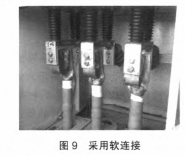 (2)穿墻套管下部與電纜銅搭子導體部分聯(lián)接選用軟聯(lián)接過渡,如圖9所示,可以去除硬聯(lián)接發(fā)生的應力,一起消除電纜通電后發(fā)生的電動力,隔絕了對穿墻套管的應力作用。