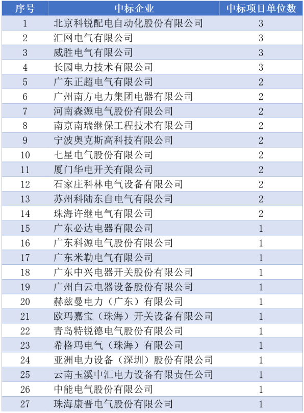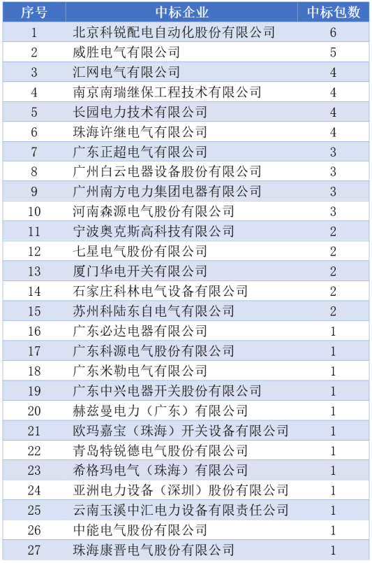 總體中標數量方面,北京科銳配電自動化股份有限公司中標金額達到約2億元;另有4家企業(yè)超過約1億元。
