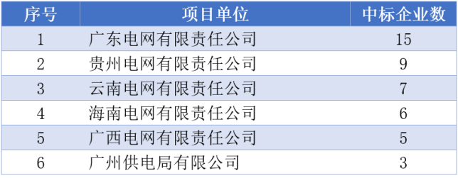 各電力公司中標企業(yè)數量方面,在廣東電網公司共有15家企業(yè)中標,全部項目單位都有超32家企業(yè)中標。